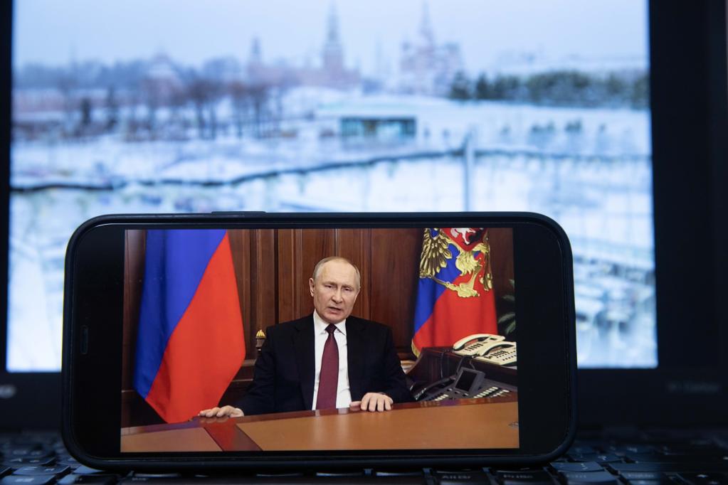 這是2月24日在俄羅斯首都莫斯科拍攝的俄總統(tǒng)普京發(fā)表電視講話的畫面。(新華社記者白雪騏攝)