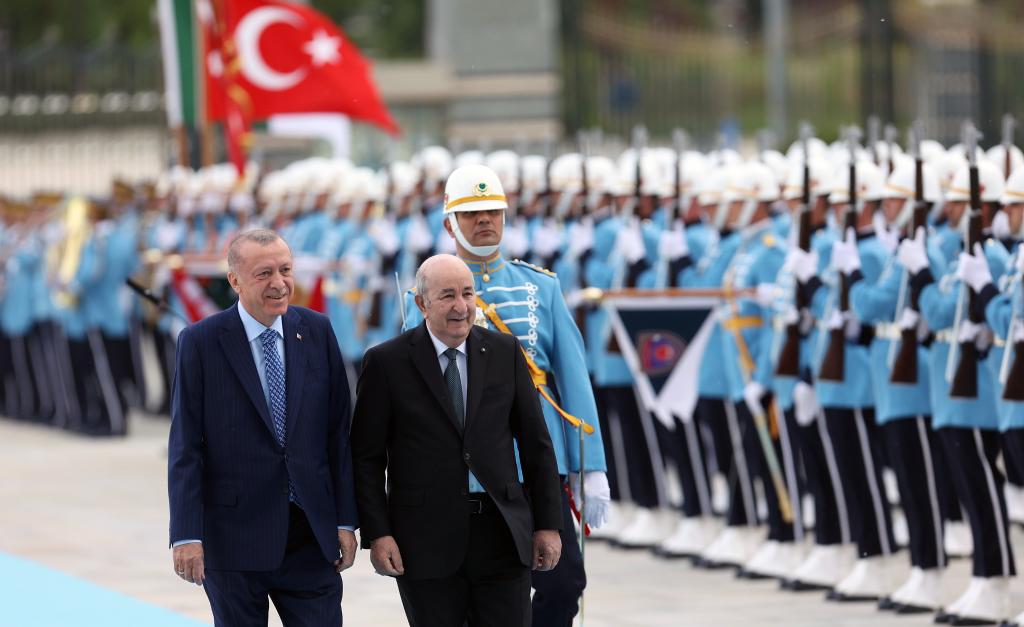 5月16日,在土耳其安卡拉,土耳其總統(tǒng)埃爾多安(左)歡迎到訪的阿爾及利亞總統(tǒng)特本。埃爾多安當日表示,土耳其不會同意芬蘭和瑞典加入北約。新華社發(fā)(穆斯塔法·卡亞攝)