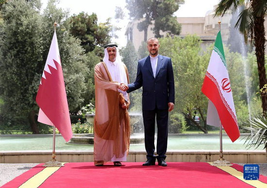 7月6日,在伊朗外長阿卜杜拉希揚(yáng)(右)在德黑蘭歡迎到訪的卡塔爾副首相兼外交大臣穆罕默德。新華社發(fā)(伊朗外交部供圖)