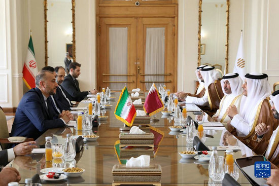 7月6日,在伊朗外長阿卜杜拉希揚(yáng)(左一)在德黑蘭會見到訪的卡塔爾副首相兼外交大臣穆罕默德(右二)。新華社發(fā)(伊朗外交部供圖)