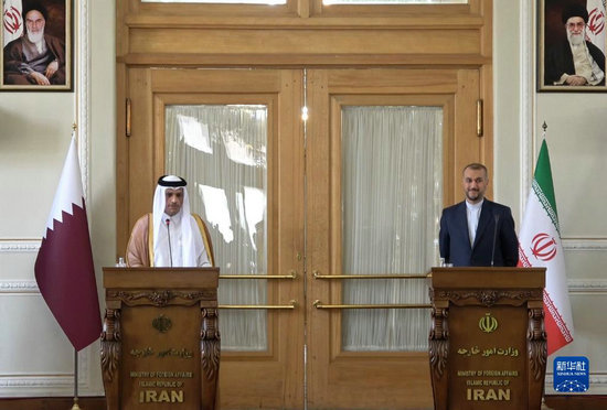 7月6日,在伊朗外長阿卜杜拉希揚(yáng)(右)在德黑蘭與到訪的卡塔爾副首相兼外交大臣穆罕默德舉行聯(lián)合記者會。新華社發(fā)(伊朗外交部供圖)