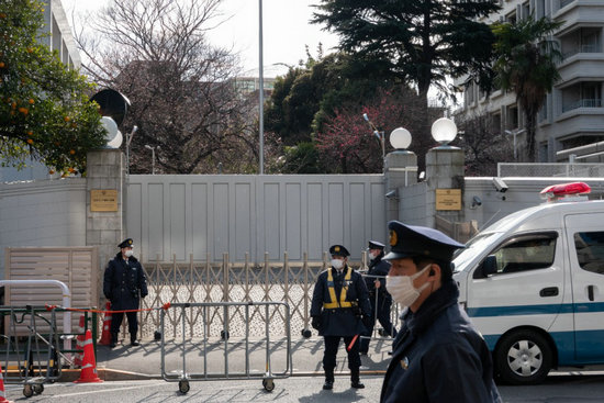 2月23日,在日本東京,警察站在俄羅斯駐日本大使館外。新華社記者張笑宇攝