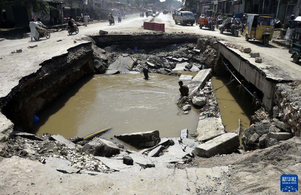 8月31日,在巴基斯坦西北部開伯爾-普什圖省的賈爾瑟達地區(qū),一段公路在洪水中被損毀。