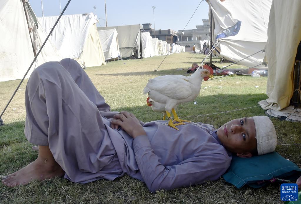 8月31日,在巴基斯坦西北部開伯爾-普什圖省的賈爾瑟達地區(qū),一名小男孩在救災(zāi)帳篷外休息。