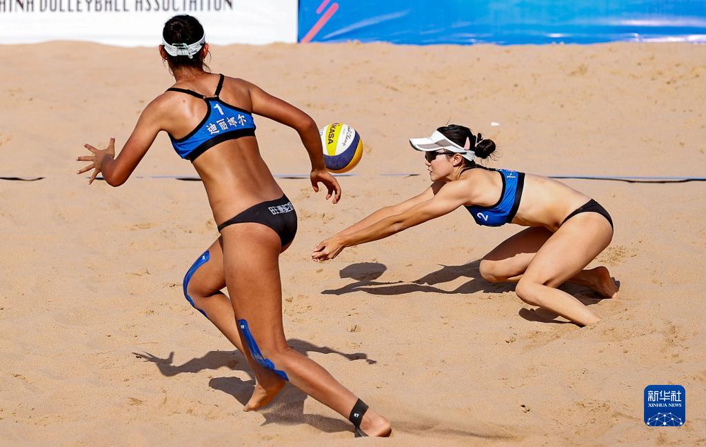 9月1日,新疆旺源一隊選手卜怡婷(右)/迪麗娜爾在比賽中救球。最終,在女子組第一階段比賽中,新疆旺源一隊選手卜怡婷/迪麗娜爾以0比2不敵山東隊選手王穎芃/張新晨。新華社記者 楊植森 攝