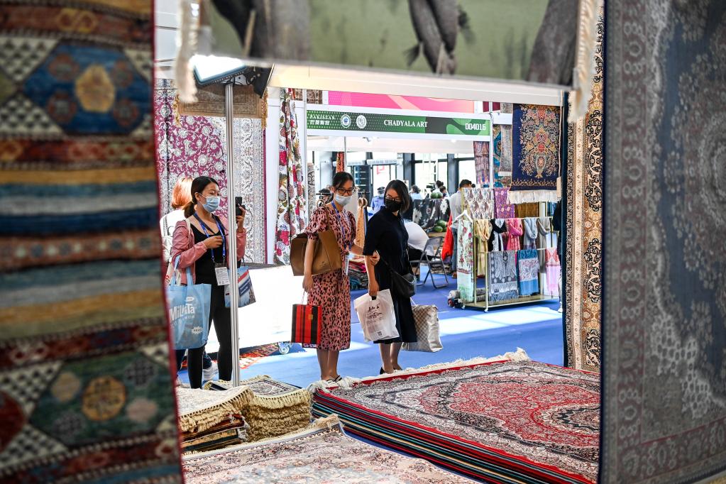 9月16日,在南寧國際會展中心,參觀者在選購地毯。正在廣西南寧舉行的第19屆中國-東盟博覽會上,不同國家和地區(qū)的文化在這里薈萃,成為一道靚麗風(fēng)景線。(新華社記者曹祎銘攝)