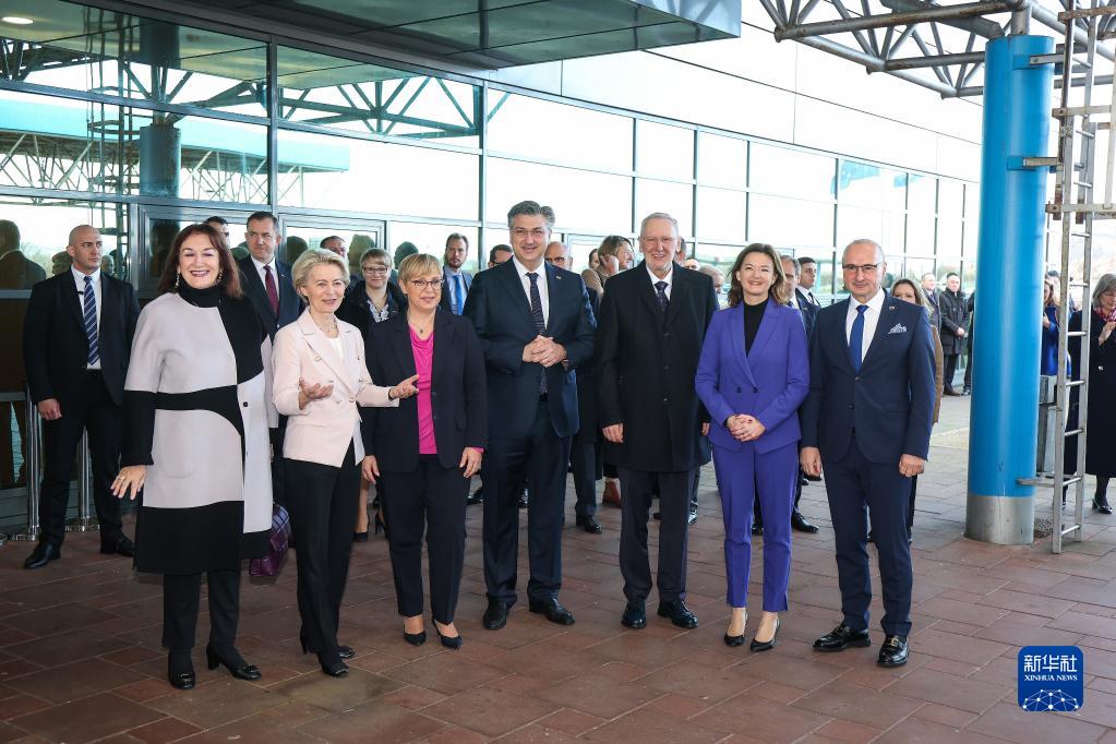 1月1日,在克羅地亞與斯洛文尼亞邊境的布雷加納,歐盟委員會(huì)主席馮德萊恩(前排左二)、克羅地亞總理普連科維奇(前排左四)和斯洛文尼亞總統(tǒng)穆薩爾(前排左三)共同慶??肆_地亞加入歐元區(qū)和申根區(qū)。新華社發(fā)(Pixsell圖片社/盧卡·施坦茨爾攝)