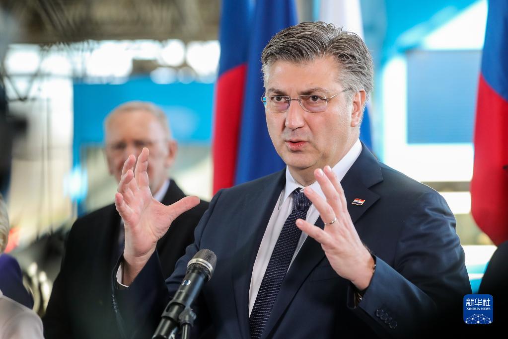 1月1日,在克羅地亞與斯洛文尼亞邊境的布雷加納,克羅地亞總理普連科維奇出席記者會(huì)。新華社發(fā)(Pixsell圖片社/盧卡·施坦茨爾攝)