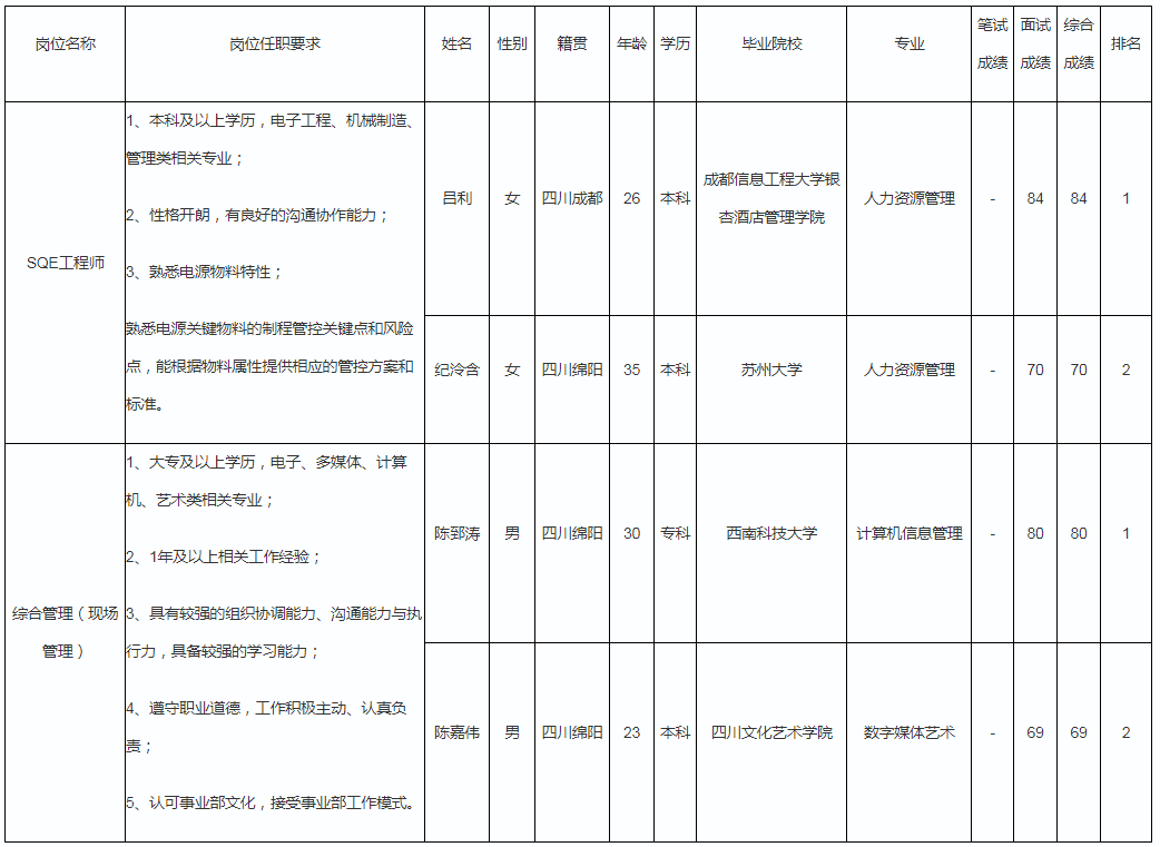 根據(jù)四川九州電子科技股份有限公司發(fā)布的招聘公告及招聘相關(guān)規(guī)定,經(jīng)筆試、面試等程序,現(xiàn)將筆試(面試)成績(jī)予以公示。