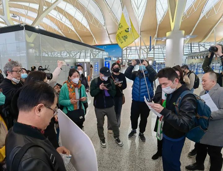 2月6日,在上海浦東國際機(jī)場,出境團(tuán)隊(duì)游領(lǐng)隊(duì)師文(舉旗者)向游客說明相關(guān)注意事項(xiàng)。新華社記者陳愛平攝