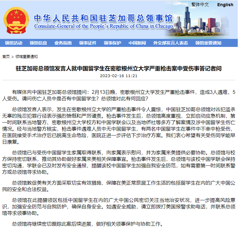 總領館發(fā)言人表示,發(fā)生在密歇根州立大學的嚴重槍擊事件令人震驚,中國駐芝加哥總領館對兇犯濫殺無辜的殘忍犯罪行徑表示強烈憤慨和嚴厲譴責。