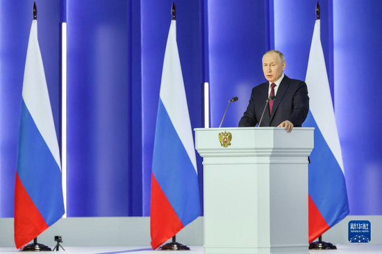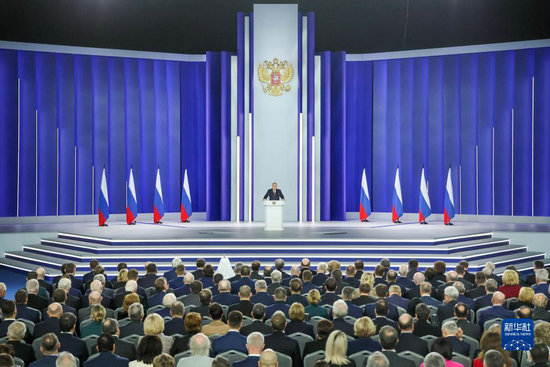 2月21日,俄羅斯總統(tǒng)普京在首都莫斯科向議會兩院發(fā)表國情咨文。新華社/塔斯社