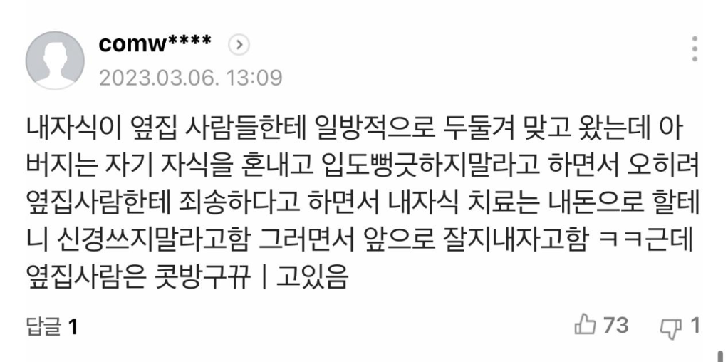 還有網(wǎng)友諷刺說:“自家小孩被鄰居暴打一頓,父親教訓(xùn)了自家挨打的孩子,不準(zhǔn)小孩還嘴,反而向鄰居道歉說,‘不要擔(dān)心,醫(yī)療費(fèi)我們自己來出,以后咱們好好做鄰居。’而鄰居對此還嗤之以鼻。”