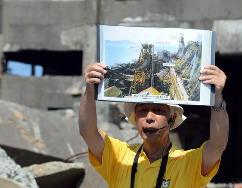 2015年8月8日,在日本長崎“軍艦島”,導(dǎo)游講解島上歷史。二戰(zhàn)期間,大量來自朝鮮半島和中國的勞工被強(qiáng)征到這座小島上勞動(dòng),受盡非人折磨甚至被虐致死。新華社記者馬平攝