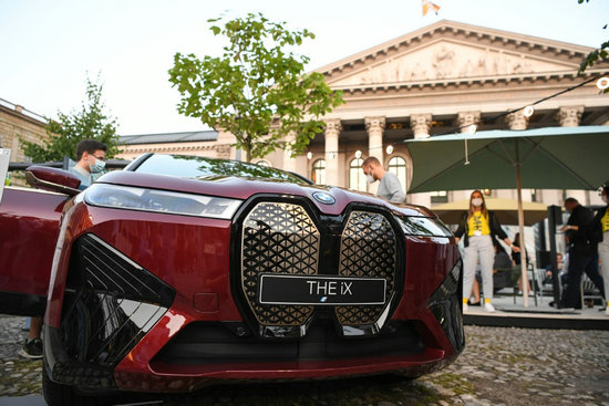 這是2021年9月8日在德國慕尼黑國際車展寶馬汽車戶外展區(qū)拍攝的一臺(tái)寶馬iX電動(dòng)車。新華社記者逯陽攝