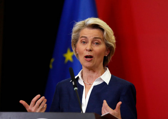 2022年10月26日,在北馬其頓斯科普里,歐盟委員會(huì)主席馮德萊恩在與北馬其頓總理科瓦切夫斯基(不在畫面中)舉行的聯(lián)合新聞發(fā)布會(huì)上講話。新華社發(fā)(托米斯拉夫·格奧爾基耶夫攝)