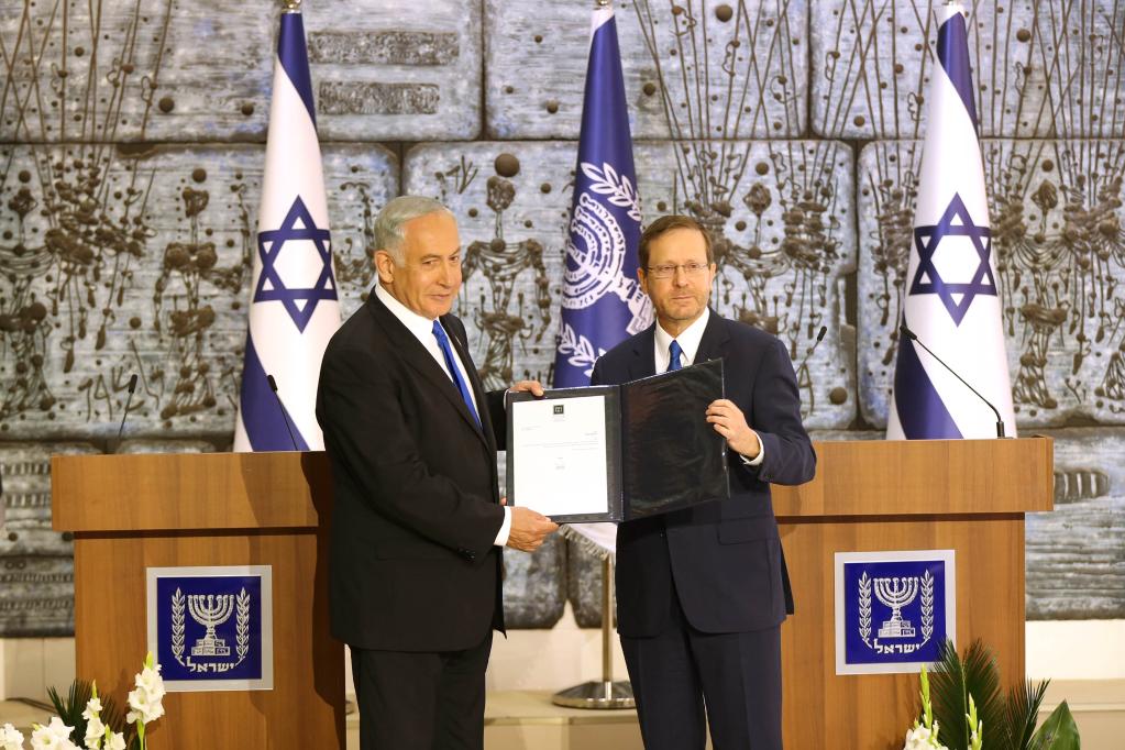 2022年11月13日,以色列總統(tǒng)赫爾佐格(右)授權(quán)利庫(kù)德集團(tuán)領(lǐng)導(dǎo)人內(nèi)塔尼亞胡(左)組建新政府。新華社記者王卓倫攝