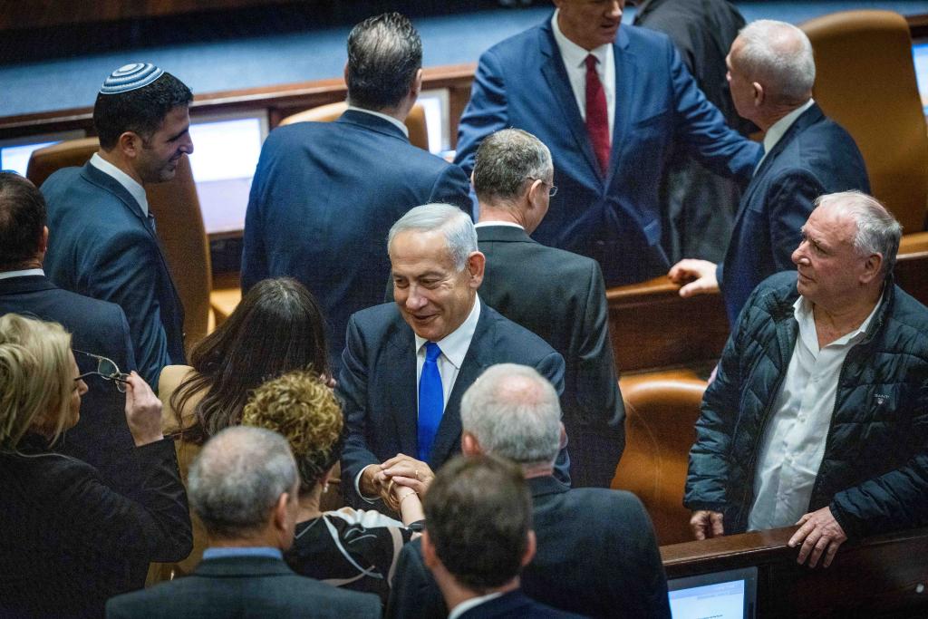 2022年12月29日,以色列新一屆政府在議會(huì)宣誓就職。圖為總理內(nèi)塔尼亞胡(中)出席議會(huì)會(huì)議。新華社/基尼圖片社