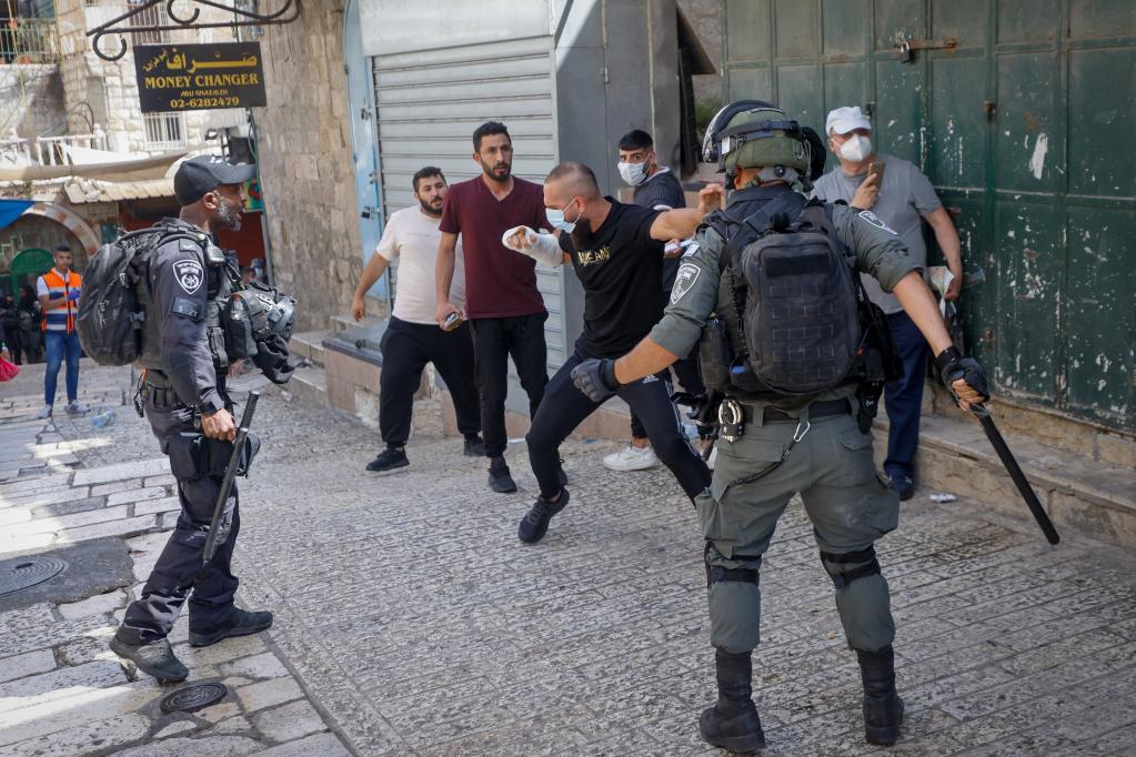 2022年5月29日,在耶路撒冷老城,巴勒斯坦抗議者與以色列警察發(fā)生沖突。新華社/基尼圖片社