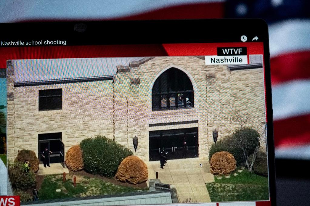 3月27日在美國(guó)阿靈頓拍攝的屏幕顯示美國(guó)田納西州一小學(xué)發(fā)生槍擊事件的現(xiàn)場(chǎng)畫面。田納西州納什維爾市一小學(xué)27日發(fā)生槍擊事件,造成包括3名兒童在內(nèi)的6人遇害,槍手被警察擊斃。新華社記者劉杰攝