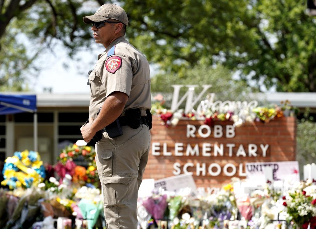 2022年5月27日,警察在美國(guó)得克薩斯州南部尤瓦爾迪市發(fā)生槍擊事件的小學(xué)外執(zhí)勤。新華社記者吳曉凌攝
