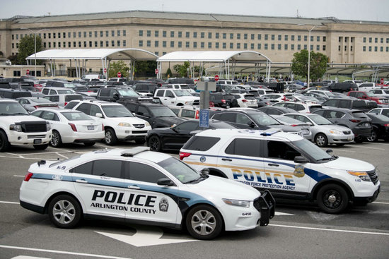 這是2021年8月3日在美國弗吉尼亞州阿靈頓的五角大樓附近拍攝的警車。新華社記者劉杰攝