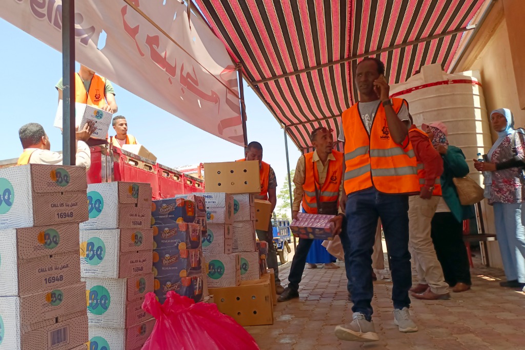 5月2日,在埃及南部阿斯旺省,工作人員為逃離蘇丹進(jìn)入埃及的難民準(zhǔn)備物資(手機拍攝)。新華社發(fā)(拉德萬攝)