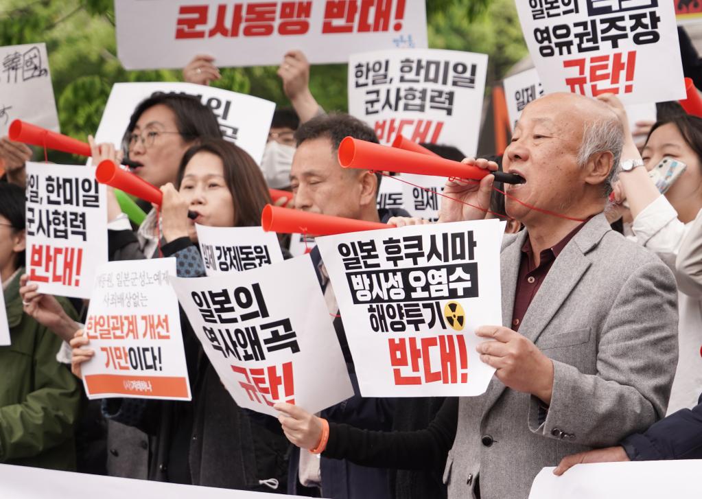 在韓國總統(tǒng)府前的集會現(xiàn)場,民眾手持“停止構(gòu)建韓美日同盟”“停止對日屈辱外交”“立即撤回核污染水排海計(jì)劃”等標(biāo)語。他們要求日本政府對二戰(zhàn)期間的殖民統(tǒng)治進(jìn)行道歉并給予賠償,強(qiáng)烈呼吁停止擴(kuò)大韓美日三方軍事合作,共同維護(hù)地區(qū)和平穩(wěn)定。