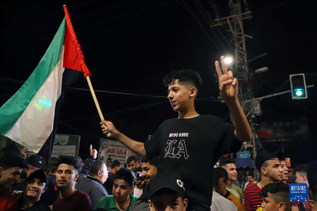 5月13日,巴勒斯坦人在加沙城街頭慶祝?;饏f(xié)議達(dá)成。新華社發(fā)(里澤克·阿卜杜勒賈瓦德攝)