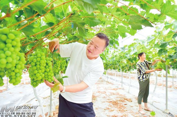 葡萄園的“農(nóng)莊主”黃健是一位“80后”返鄉(xiāng)創(chuàng)業(yè)青年,今年是他創(chuàng)業(yè)十周年。“家在農(nóng)村,根在農(nóng)村,一直喜歡農(nóng)事。”黃健說,2013年他辭去了在成都干了多年的園林綠化工作,回到老家流轉(zhuǎn)了60畝土地,專門種植葡萄。為了創(chuàng)業(yè)成功,他先后到山東、西昌等地取經(jīng),在有葡萄種植經(jīng)驗(yàn)的朋友幫助下,第三年順利實(shí)現(xiàn)了葡萄掛果。經(jīng)過不斷地“提質(zhì)增效”,如今他的葡萄園已經(jīng)是楊關(guān)大道上具有規(guī)模的特色產(chǎn)業(yè),一串串“俏葡萄”更成為城區(qū)水果店老板們爭(zhēng)相上門搶購的優(yōu)質(zhì)貨源。