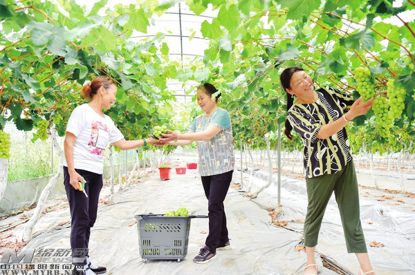 掛滿碩果的大棚、平坦的水泥道路、貫穿葡萄園的溝渠……一處處過硬的基礎(chǔ)設(shè)施對(duì)返鄉(xiāng)創(chuàng)業(yè)者安心發(fā)展特色農(nóng)產(chǎn)業(yè)帶來了硬件上的保障。“你看到的大棚、道路、水渠等都有政府和村委會(huì)在背后的幫助和支持。”黃健說,除了這些,創(chuàng)業(yè)路上還得到了資金補(bǔ)助。一人富不算富,大家富才是真的富。如今,黃健正帶領(lǐng)周邊十余家葡萄種植散戶一起走在增收致富的道路上,從優(yōu)選品種到田間管理、銷售渠道,為大家全方位免費(fèi)提供服務(wù)。