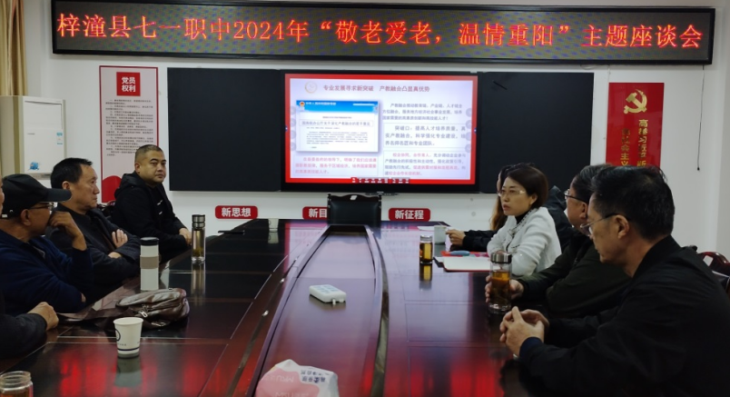 在重陽節(jié)之際,梓潼縣“七一”高級職業(yè)中學舉行了以“敬老愛老,溫情重陽”為主題的2024年重陽節(jié)座談會及系列活動,該校黨支部書記、校長梁金蓉、副校長王桂平、陳超等校領(lǐng)導同受邀請的退休老教師一道歡度重陽節(jié)。