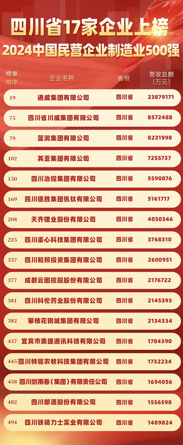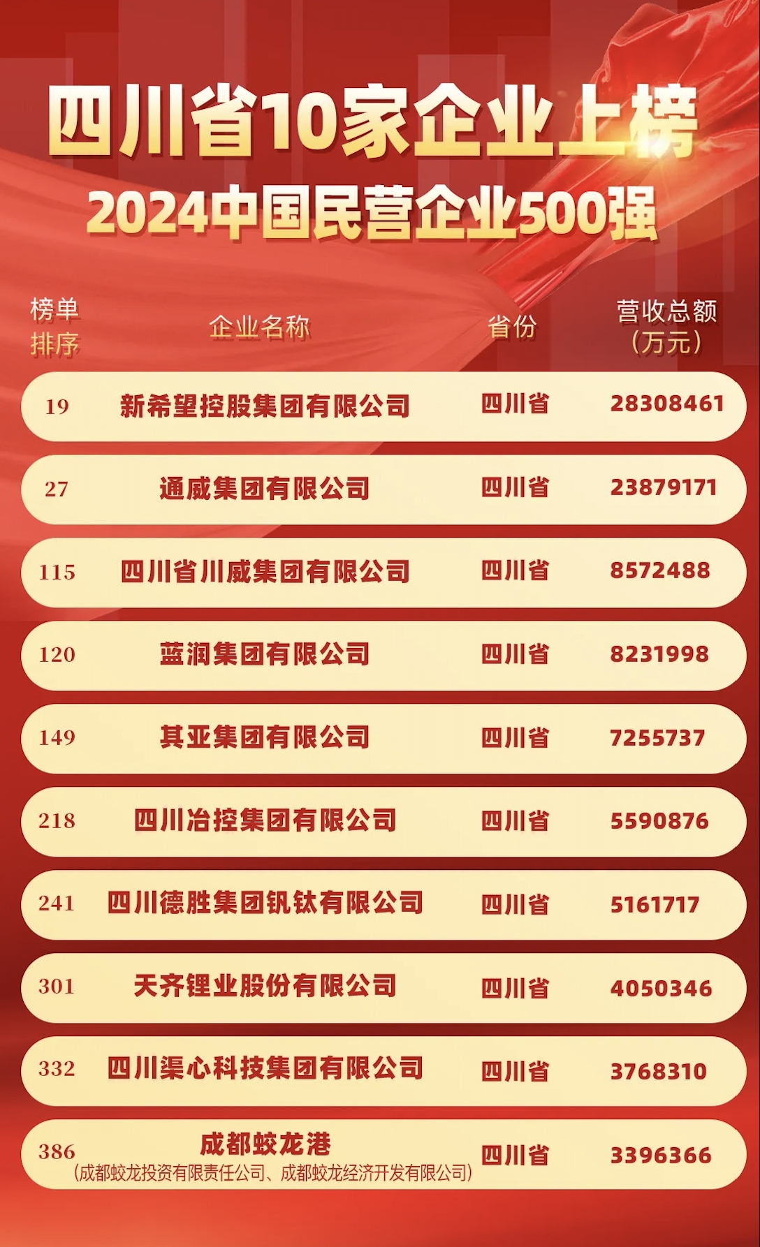 上榜中國(guó)民營(yíng)企業(yè)500強(qiáng)的10家川企分別是新希望集團(tuán)、通威集團(tuán)、川威集團(tuán)、藍(lán)潤(rùn)集團(tuán)、其亞集團(tuán)、四川冶控集團(tuán)、德勝集團(tuán)釩鈦有限公司、天齊鋰業(yè)股份有限公司、四川渠心科技集團(tuán)、成都蛟龍港。