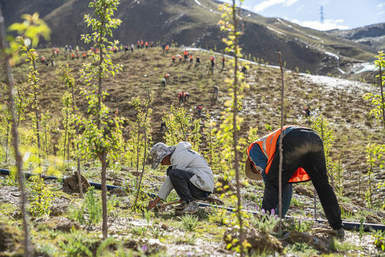 2023年6月18日,工人在西藏拉薩市城關區(qū)次角林村附近的山上播種造林。新華社記者 孫非 攝