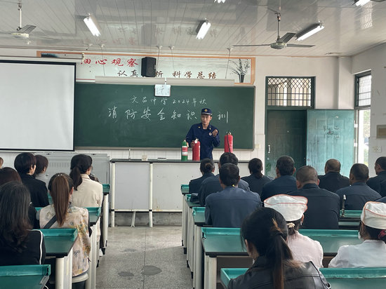 綿陽新聞網(wǎng)訊 為了切實貫徹落實消防安全工作,提高后勤、安保人員消防安全意識和自防自救技能,10月17日,梓潼縣文昌中學(xué)邀請梓潼縣消防中隊消防員班長楊勝,到校開展了以“消防安全進校園,筑牢校園‘防火墻’”為主題的2024年秋“消防安全進校園”培訓(xùn)活動。