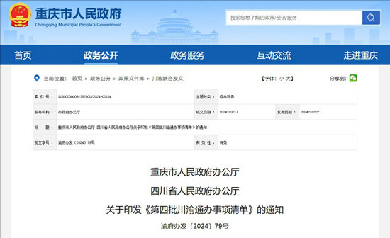 另據(jù)四川省人民政府網(wǎng)站消息,省政務(wù)改革推進(jìn)辦發(fā)布關(guān)于印發(fā)《第四批川渝通辦事項(xiàng)清單》的通知解讀,解讀如下: