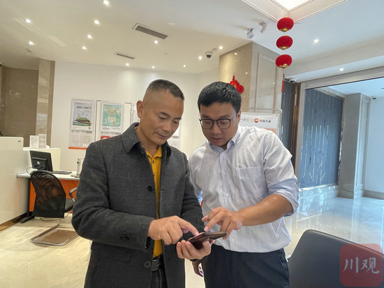 雅安市創(chuàng)業(yè)者齊天(左)在金融機(jī)構(gòu)工作人員指點(diǎn)下,通過手機(jī)在網(wǎng)上申請創(chuàng)業(yè)擔(dān)保貸款