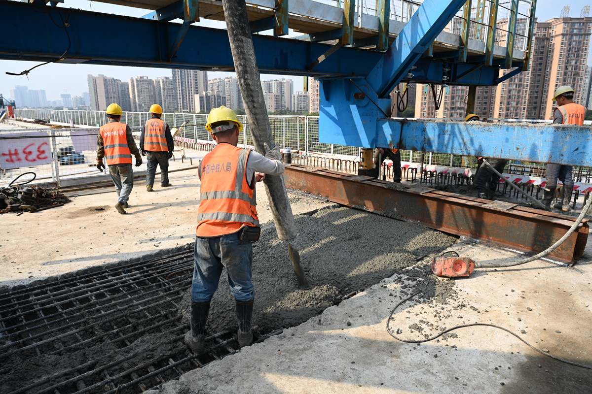 成渝中線高鐵動走線跨沙河特大橋位于四川省成都市金牛區(qū),全長約1.47公里,以現(xiàn)澆連續(xù)梁方式跨越沙河、既有駟馬橋城市主干道路、成都地鐵3號線及新建客機整備所西咽喉區(qū)。其中,主跨采用“掛籃懸臂澆筑施工法”施工,施工人員將連續(xù)梁分為14個標準節(jié)段施工,共澆筑混凝土9000余立方米,相當于約4個奧運會標準游泳池的容量。