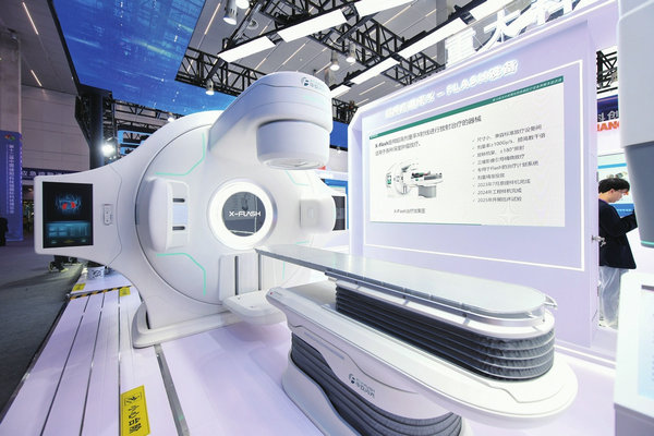 這是11月6日在第十二屆中國(綿陽)科技城國際科技博覽會(huì)上拍攝的超高劑量率X射線FLASH放射治療設(shè)備模型。