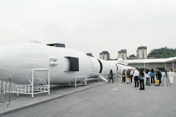 11月6日,在第十二屆中國(綿陽)科技城國際科技博覽會(huì)現(xiàn)場,參會(huì)者參觀運(yùn)載火箭模型。
