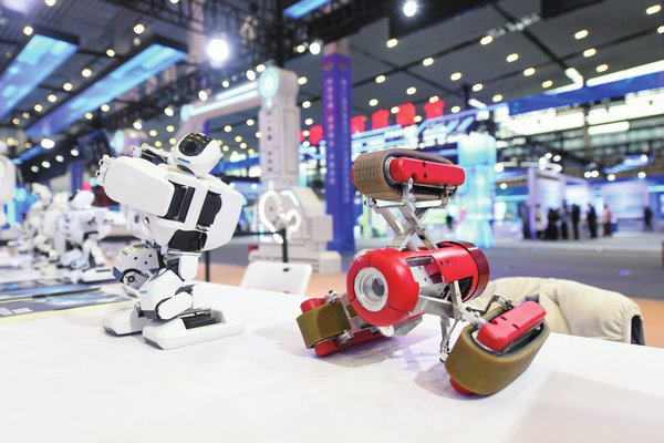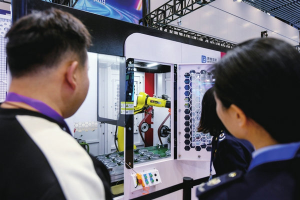 11月6日,在第十二屆中國(綿陽)科技城國際科技博覽會(huì)現(xiàn)場,參會(huì)者觀看運(yùn)行中的工業(yè)機(jī)器人。
