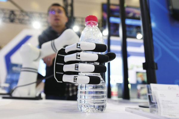 這是11月6日在第十二屆中國(綿陽)科技城國際科技博覽會(huì)上拍攝的機(jī)器人仿生手。