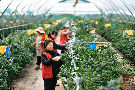 涼山州會東縣藍(lán)莓現(xiàn)代農(nóng)業(yè)產(chǎn)業(yè)園區(qū),工人們正在采摘大棚忙碌。
