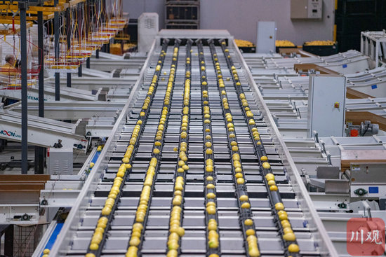 位于資陽市安岳縣的四川省維記果品有限公司分揀車間,成千上萬顆檸檬正經(jīng)過智能化分揀線檢測。