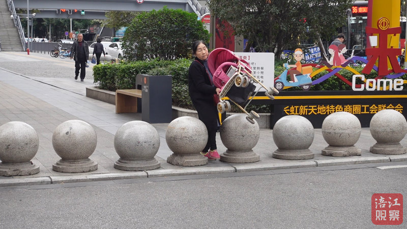 記者實(shí)地走訪,在涪城區(qū)長虹國際廣場的人行道上看到,阻車的石墩如同棋盤上的棋子般緊湊排列。市民們在此處通行時,遭遇諸多困擾,正常行走時雙腳都要小心翼翼地卡著石墩間的狹小縫隙才能通過,而那些推著嬰兒車的市民則只能將嬰兒車抬高通行。“我每次帶寶寶出來散步,走到這兒都得把嬰兒車抬起來,特別費(fèi)勁。”市民王女士說。