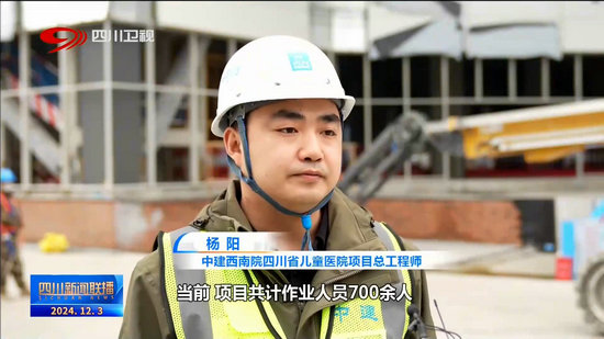 中建西南院四川省兒童醫(yī)院項目總工程師 楊陽:緊盯建設(shè)目標(biāo)不放松,當(dāng)前,項目共計作業(yè)人員700余人,力爭到年底,完成項目整體外立面幕墻工程以及機(jī)電安裝工程施工,為我們明年裝飾裝修工程以及醫(yī)療專項工程施工奠定基礎(chǔ)條件,項目建成后將進(jìn)一步提升四川省兒童醫(yī)療服務(wù)水平。