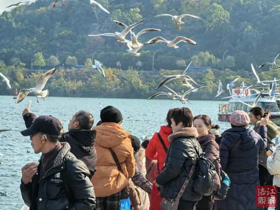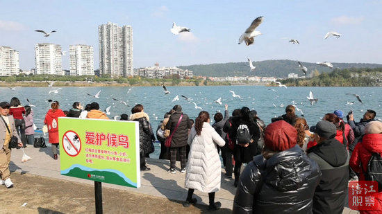 然而,“和諧”之下,依然存在“煞風(fēng)景”的行為。12月10日14時(shí)許,記者在三江半島景區(qū)看到,不少市民紛紛將手中的面包掰成小塊拋至空中,引來(lái)紅嘴鷗搶食,還有部分市民試圖與紅嘴鷗“親密接觸”。
