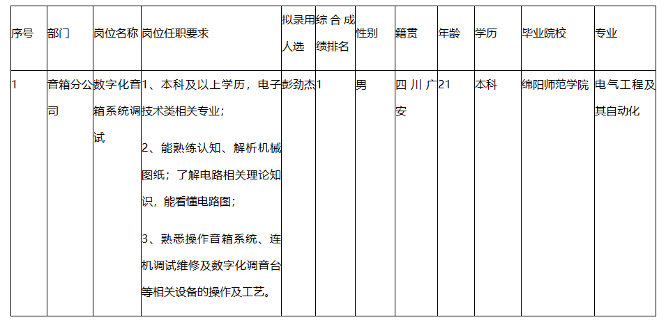 根據(jù)四川湖山電器股份有限公司發(fā)布的招聘公告及招聘相關(guān)規(guī)定,經(jīng)筆試、面試、考察、體檢等程序,擬錄用彭勁杰同志到四川湖山電器股份有限公司工作,現(xiàn)予以公示,具體情況如下: