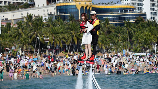 2月13日,游客在海南省三亞市大東海景區(qū)體驗“水上飛人”項目。新華社記者 趙穎全 攝