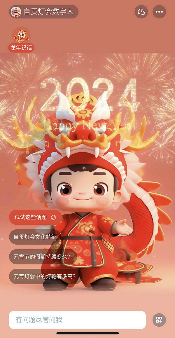 這位新接待員既是一個人,也可以變成千萬人,你看不見它,它卻無處不在。它就是今年首次上線的自貢燈會數(shù)字人。從2月4日上線以來,已累計服務游客超5萬人次。游客掃描二維碼進入數(shù)字人的世界,關于本屆燈會的一切問題,它都能為你解答,如同自貢燈會版chatGPT。